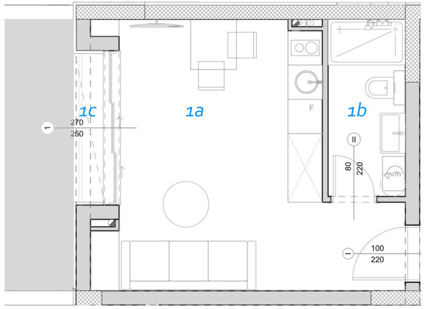 1a. Dnevna i noćna zona P= 19.24 m2 O= 21.34 m Keramika Akrilna latex boja Akrilna latex boja