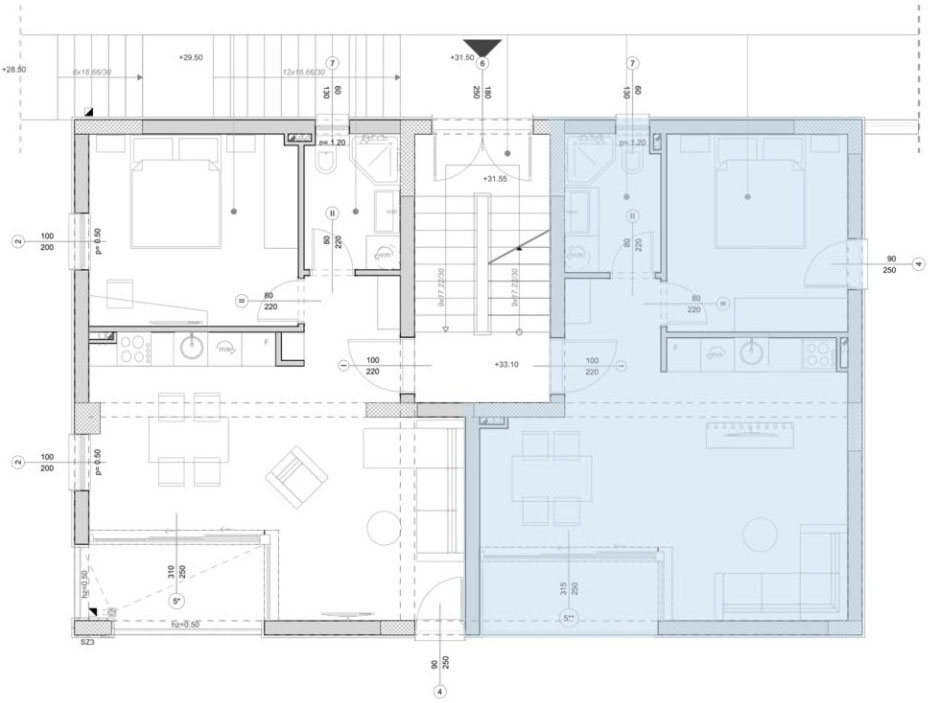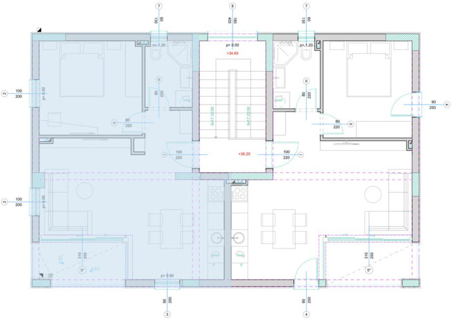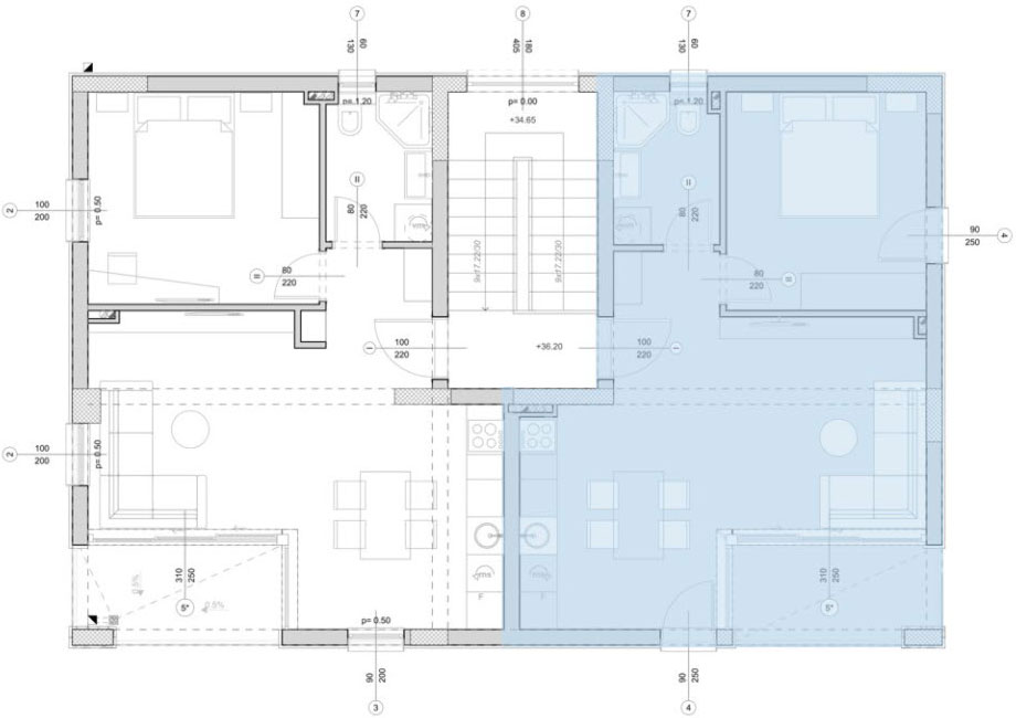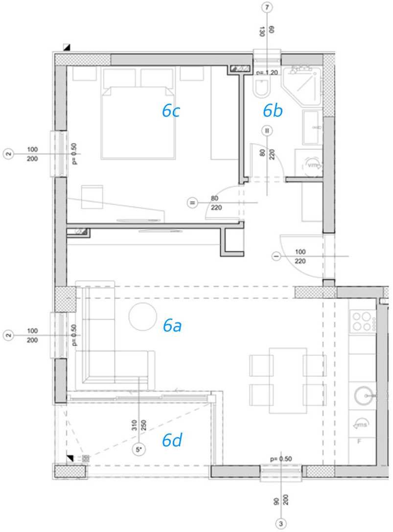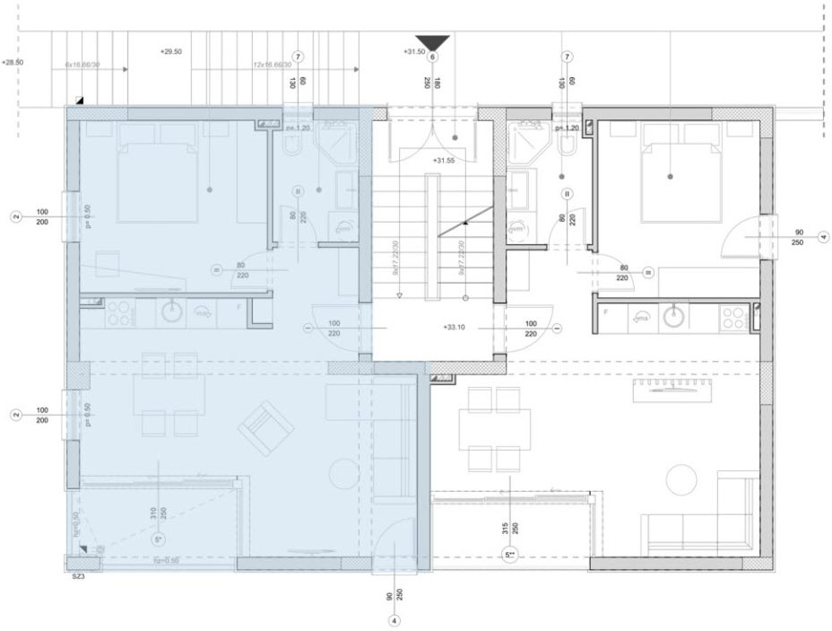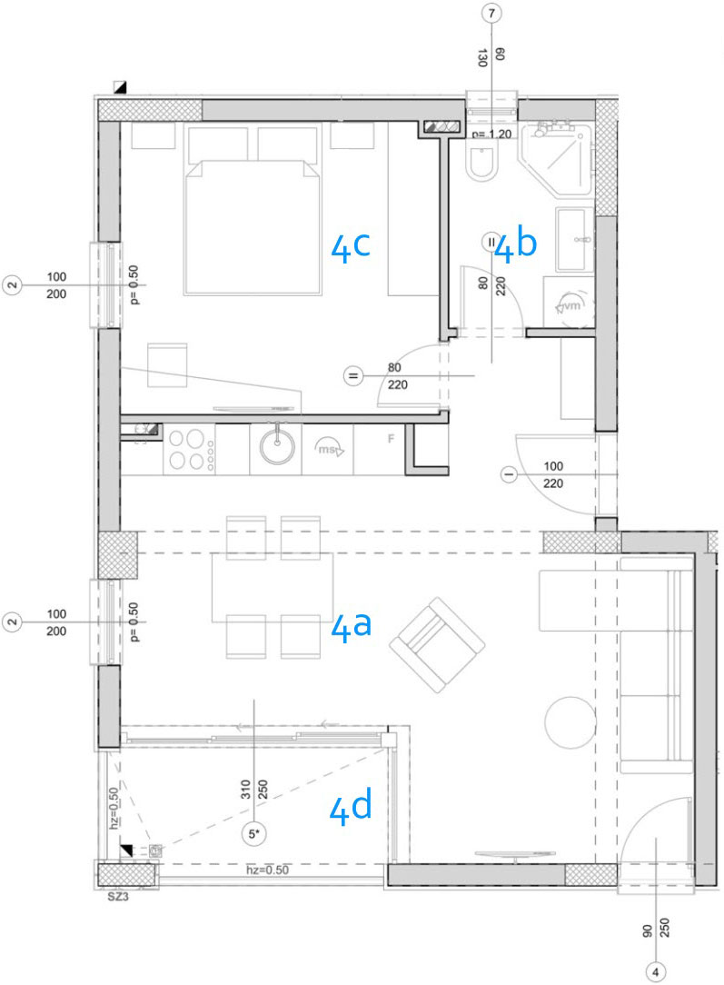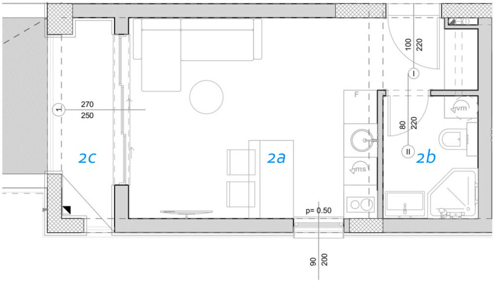 2a. Dnevna i noćna zona P= 17.85 m2 O= 19.54 m Keramika Akrilna latex boja Akrilna latex boja